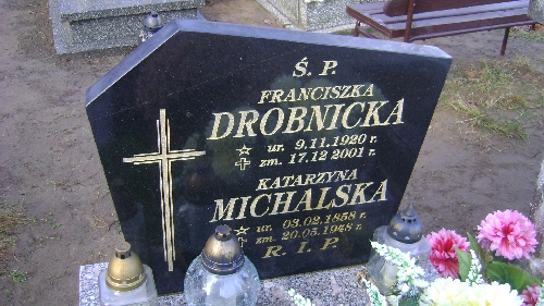 Grób: I.11.6 Drobnicka Franciszka ur.:09.11.1920 zm.:17.12.2001 Michalska Katarzyna ur.:03.02.1858 zm.:20.05.1948 |