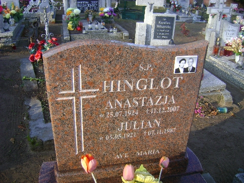 Grób: I.6.4 Hinglot Anastazja ur.:25.07.1924 zm.:11.12.2007 Hinglot Julian ur.:05.05.1921 zm.:07.11.1987 |
