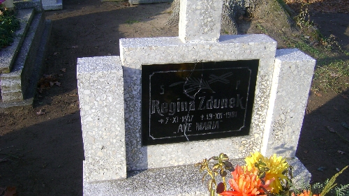 Grób: I.8.42 Zdunek Regina ur.:07.11.1917 zm.:19.12.1981 Zdunek Aleksander ur.:10-01-1910 zm.:28-04-1972 |
