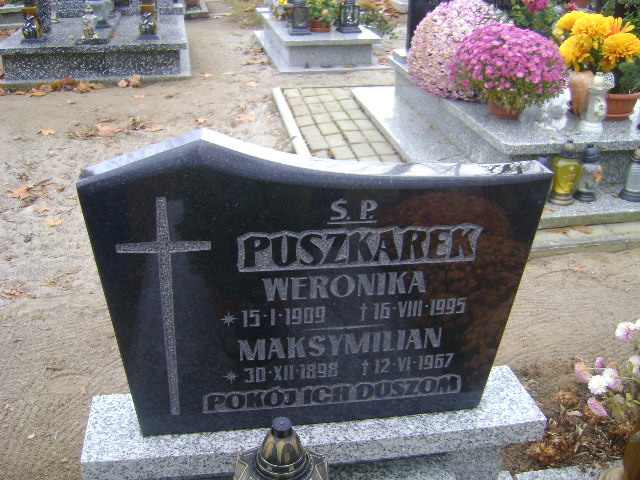 Grób: I.16.11 Puszkarek Weronika ur.:15.01.1909 zm.:16.08.1995 Puszkarek Maksymilian ur.:30.12.1898 zm.:12.06.1967 |