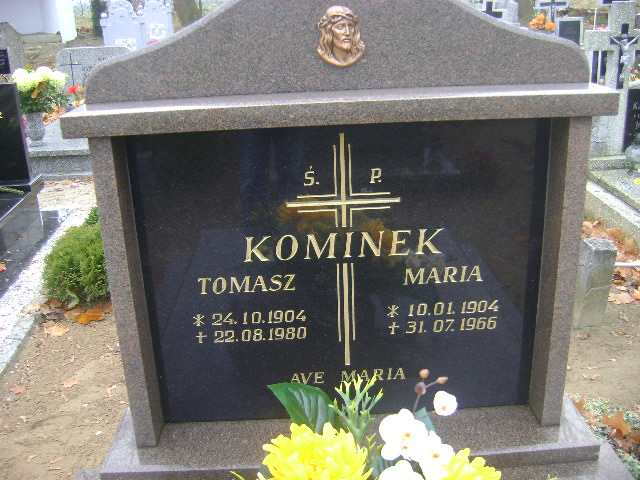 Grób: I.16.7 Kominek Tomasz ur.:24.10.1904 zm.:22.08.1980 Kominek Maria ur.:10.01.1904 zm.:31.07.1996 |