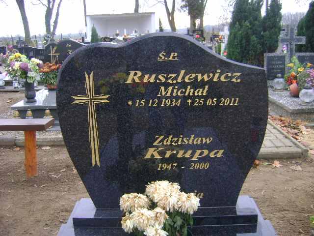 Grób: I.21.3 Krupa Zdzisław ur.:1947 zm.:200 Ruszlewicz Michał ur.:15.12.1934 zm.:25.05.2011 Ruszlewicz teresa ur.:01-05-1939 zm.:05-05-2019 |