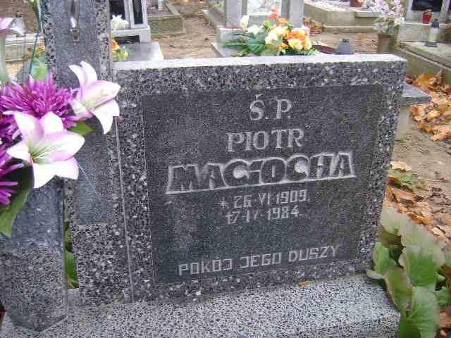 Grób: I.5.3 Maciocha Piotr ur.:26.06.1909 zm.:7.04.1984 Gogojewicz Krystyna ur.:19-03-1938 zm.:01-04-2020 Gogojewicz Jan ur.:30-08-1957 zm.:10-01-2022 Gogojewicz Michał ur.:02-02-1927 zm.:25-06-2023 |