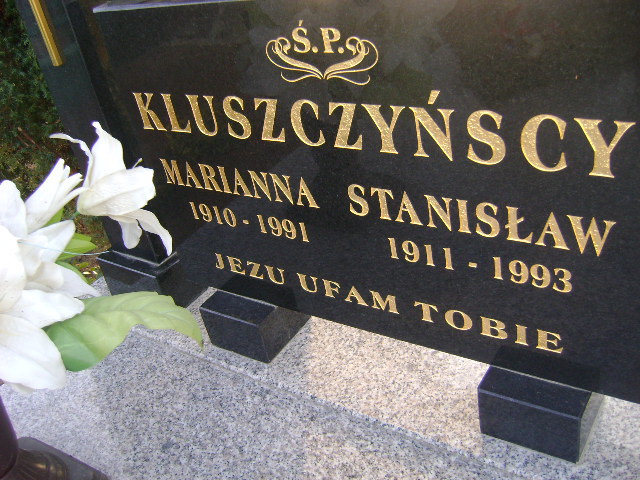 Grób: I.2.30 Kluszczyńska Marianna ur.:18.1.1910 zm.:29.9.1991 Kluszczyński Stanisław ur.:21.11.1915 zm.:12.1.1993 |