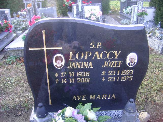 Grób: I.5.18 Łopacka Janina ur.:17.06.1936 zm.:14.06.2001 Łopacki Józef ur.:23.01.1923 zm.:23.01.1975 |