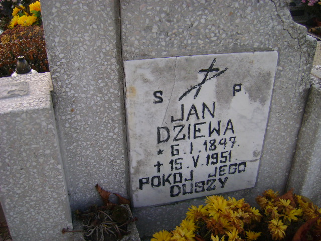 Grób: I.8.15 Dziewa Jan ur.:06.01.1847 zm.:15.05.1951 Dziewa Krystyna ur.:28-01-1933 zm.:27-06-2015 |