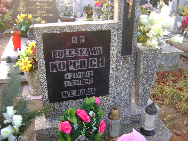 Grób: I.9.45 Kopciuch Bolesława ur.:07.04.1912 zm.:12.06.1992 Kopciuch Janina ur.:28-04-1947 zm.:11-02-2016 Kopciuch Jan ur.:1947 zm.:17-12-1965 Kopciuch Zygmunt ur.:18-04-1946 zm.:23-07-2020 |