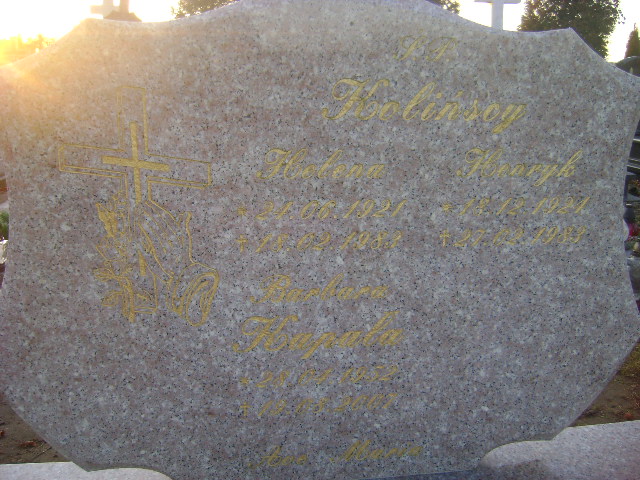 Grób: I.9.46 Kapala Barbara Helena ur.:28.04.1952 zm.:19.08.2007 Kolińska Helena ur.:24.06.1921 zm.:18.03.1982 Koliński Henryk ur.:18.12.1921 zm.:27.02.1983 |