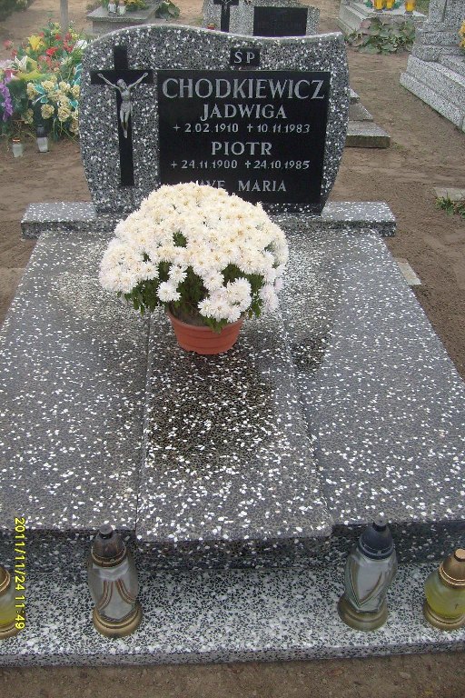 Grób: II,III,8i9 Chodkiewicz Piotr ur.:1900-11-24 zm.:1985-10-24 Chodkiewicz Jadwiga ur.:1910-02-02 zm.:1983-11-10 |