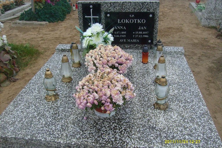 Grób: III,III,28i29 Łokotka Jan ur.:1897-08-15 zm.:1986-12-27 Łokotka Anna ur.:1895-07-06 zm.:1969-04-05 |