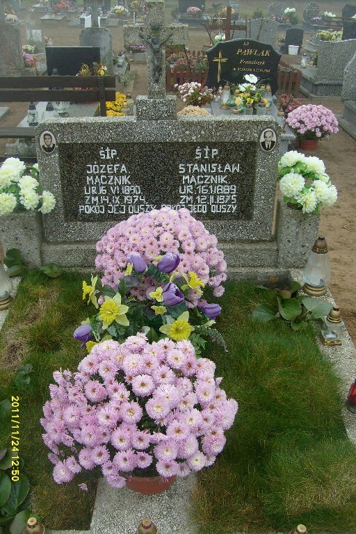Grób: IV,I,21i22 Mącznik Józefa ur.:1890-06-16 zm.:1974-09-14 Mącznik Stanisław ur.:1889-01-16 zm.:1975-02-12 Pawlak Irena ur.:1931-05-25 zm.:2018-09-05 |