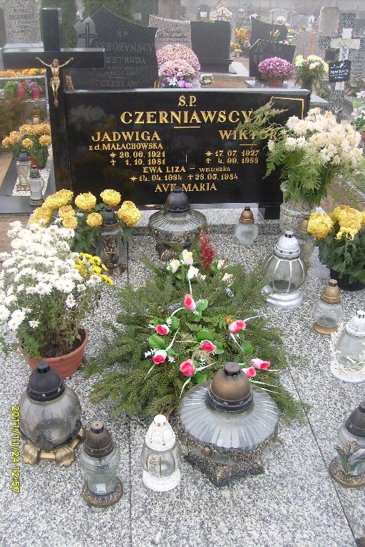 Grób: IV,II,14i15 Czerniawska Jadwiga ur.:1921-06-26 zm.:1981-10-01 Czerniawska Eliza ur.:1984-04-14 zm.:1984-05-28 Czerniawski Wiktor ur.:1927-07-17 zm.:1988-09-04 Czerniawski Andrzej Władysław ur.:1954-11-16 zm.:2025-02-27 |