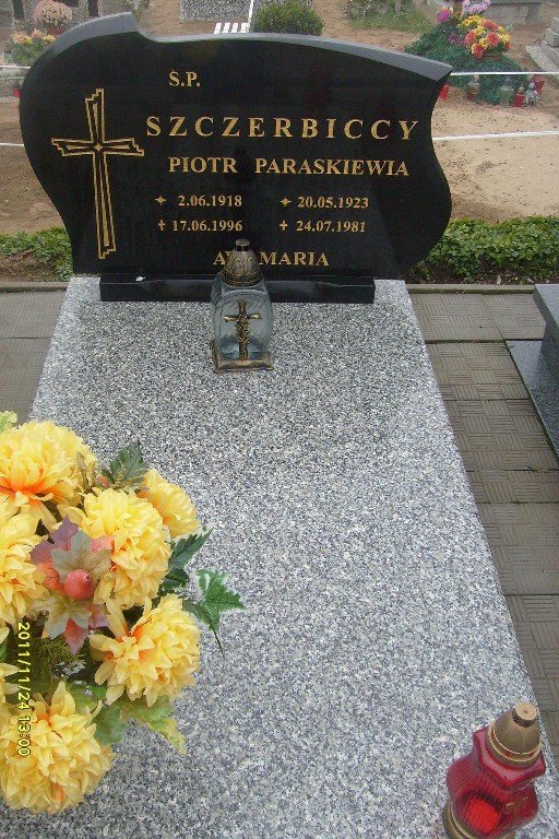 Grób: IV,II,29i30 Szczerbicka Paraskiewia ur.:1923-05-20 zm.:1981-07-24 Szczerbicka Piotr ur.:1918-06-02 zm.:1996-06-17 |