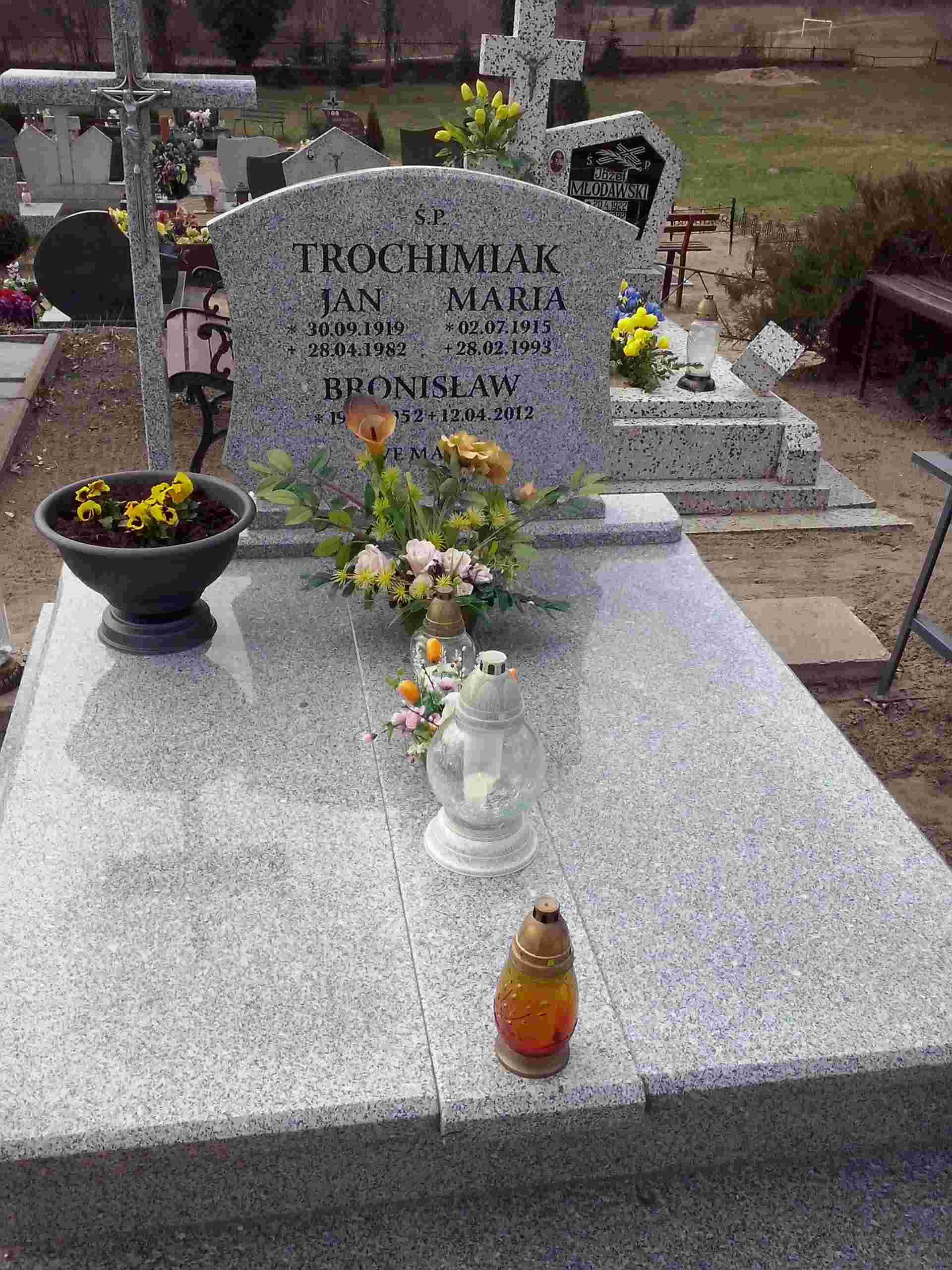 Grób: IV,III,29i30 Trochimiak Bronisław ur.:1952-10-19 zm.:2012-04-12 Trochimiak Maria ur.:1915-07-02 zm.:1993-02-28 Trochimiak Jan ur.:1919-09-30 zm.:1982-04-28 |
