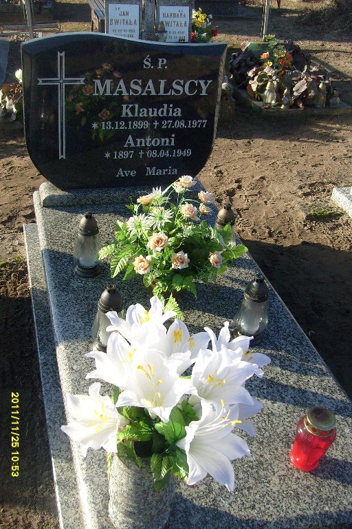 Grób: IV,VI,6i7 Masalska Klaudia ur.:1899-12-13 zm.:1977-08-27 Masalski Antoni ur.:1897-01-01 zm.:1949-04-08 |