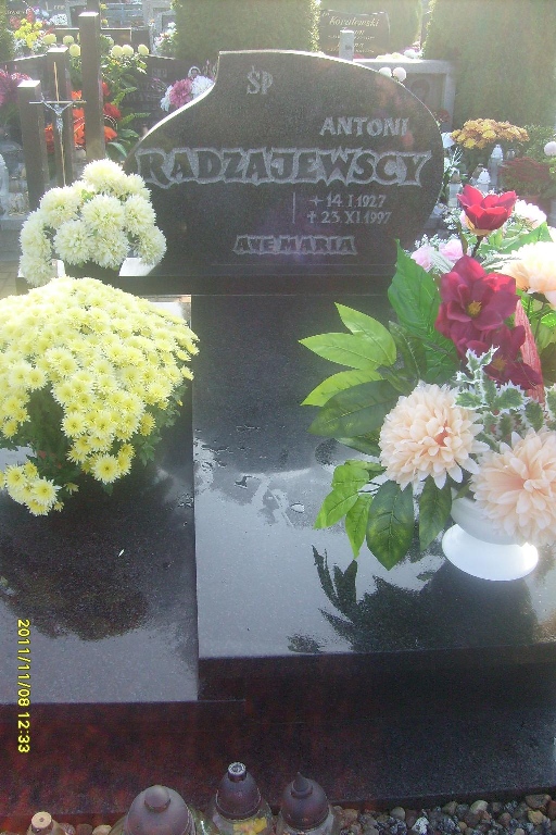 Grób: I,IX,10i11 miejsce dla 2 osoby ur.: zm.: Radzajewski Antoni ur.:1927-01-14 zm.:1997-11-23 Radzajewska Irena ur.:1935-11-20 zm.:2017-09-29 |