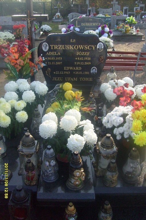 Grób: I,VI,6i7 Trzuskowska Adela Stefania ur.:1933-03-30 zm.:2007-11-21 Trzuskowski Edward ur.:1963-12-22 zm.:1981-01-25 Trzuskowska Adela ur.:1933-03-30 zm.:2007-11-21 Trzuskowski Józef ur.:1920-02-08 zm.:2009-12-19 |