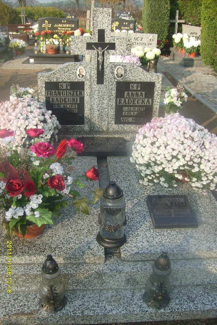Grób: I,IV,4i5 Radecka Anna ur.:1923-04-26 zm.:1992-10-23 Radecki Franciszek ur.:1916-03-27 zm.:1993-12-04 Radecki Władysław ur.:1893-01-21 zm.:1961-12-14 |