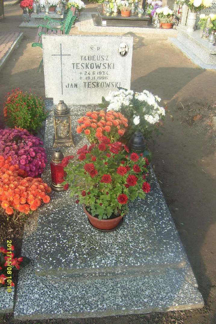 Grób: I,IV,6 Teskowski Tadeusz ur.:1934-06-24 zm.:1996-02-19 Teskowski Jan ur.: zm.: Teskowski Ignacy ur.: zm.:1975-01-20 Teskowska Marianna ur.: zm.:1947-04-16 |