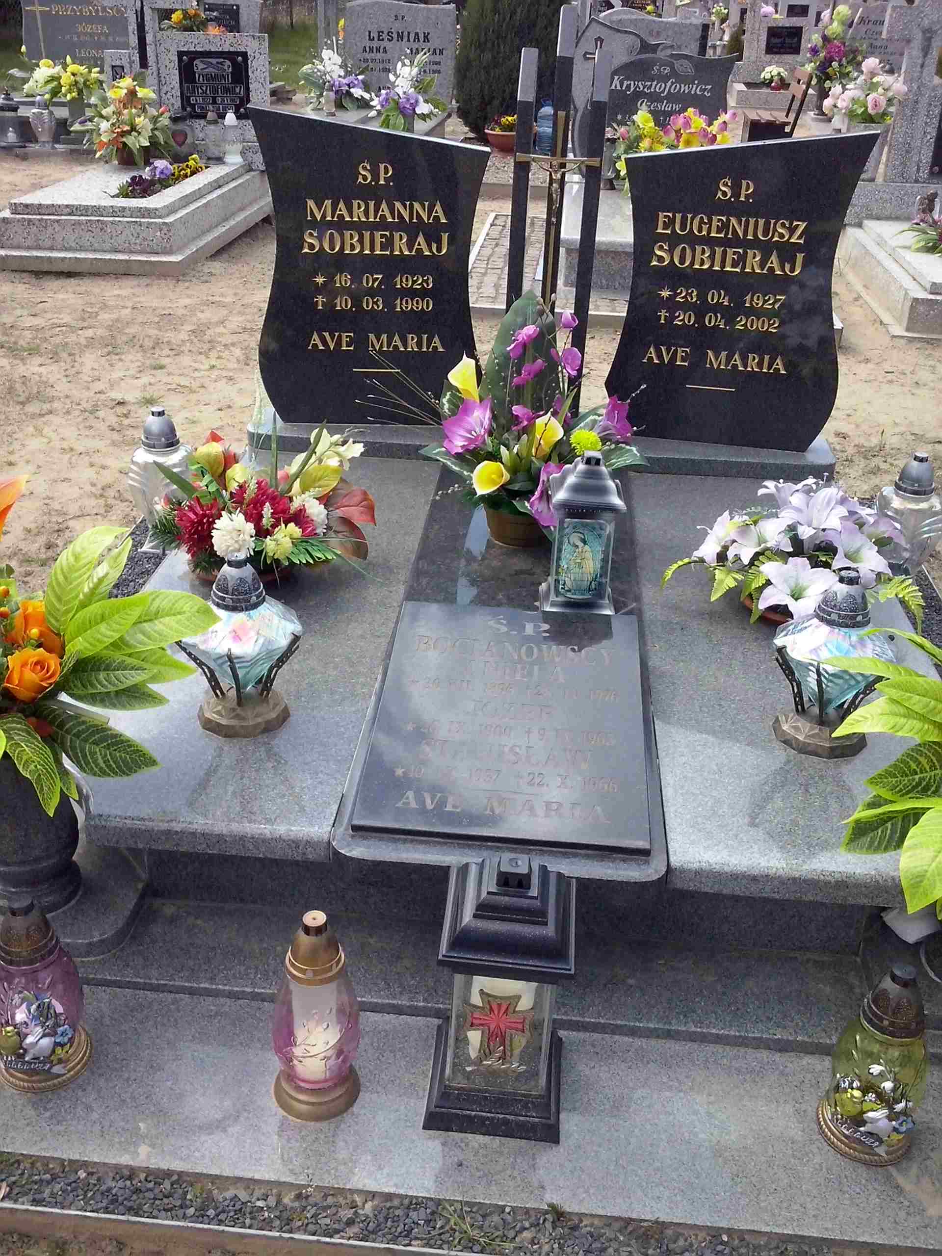 Grób: II,IV,11i12 Sobieraj Eugeniusz ur.:1927-04-23 zm.:2002-04-20 Sobieraj Marianna ur.:1923-07-16 zm.:1990-03-10 Bocianowska Aniela ur.:1896-07-30 zm.:1976-04-28 Bocianowski Józef ur.:1900-09-26 zm.:1963-04-09 Bocianowski Stanisław ur.:1937-09-10 zm.:1966-10-22 |