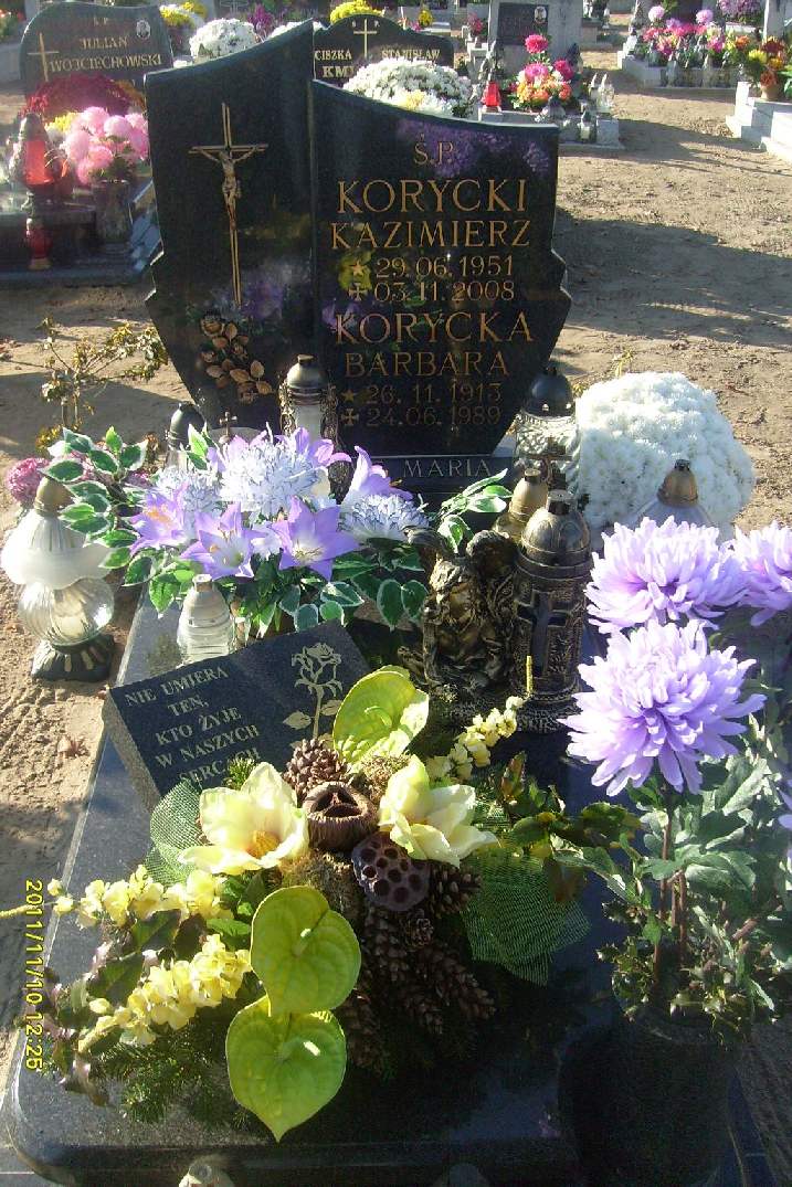 Grób: II,IV,7i8 Korycki Kazimierz ur.:1951-06-29 zm.:2008-11-03 Korycka Barbara ur.:1913-11-26 zm.:1989-06-24 |