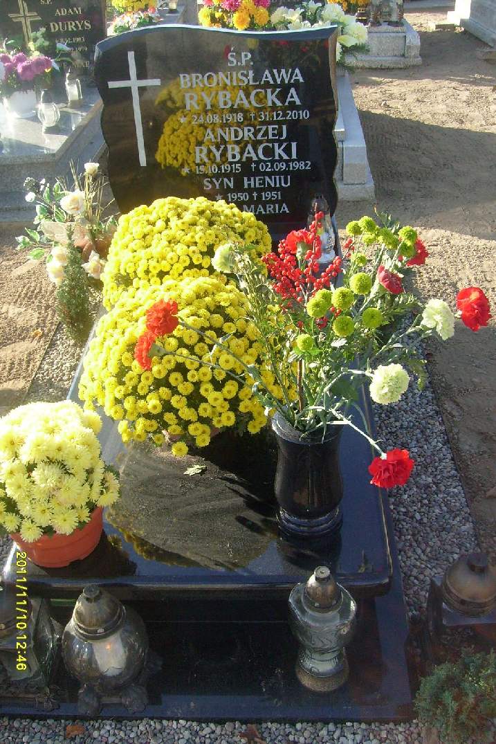 Grób: II,VIII,11 Rybacka Bronisława ur.:1918-08-24 zm.:2010-12-31 Rybacki Andrzej ur.:1915-10-15 zm.:1982-09-02 Rybacki Henryk ur.:1950-01-01 zm.:1951-01-01 |
