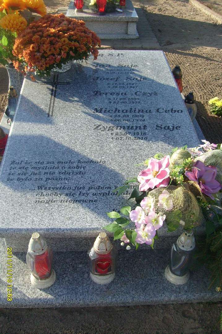 Grób: II,X,1i2 Saje Jan ur.:1945-03-30 zm.:1945-12-05 Saje Józef ur.:1947-03-17 zm.:1947-03-26 Saje Zygmunt ur.:1916-07-23 zm.:2010-10-07 Czyż Teresa ur.:1899-09-11 zm.:1972-09-24 Cebo Michalina ur.:1899-08-23 zm.:1974-06-06 Saje Stanisława ur.:1921-07-10 zm.:2016-11-05 |