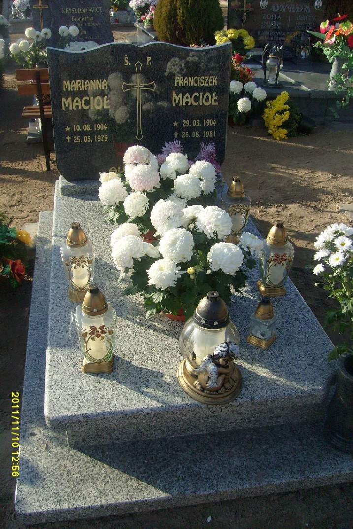 Grób: II,XI,3 Macioł Marianna ur.:1904-08-10 zm.:1975-05-25 Macioł Franciszek ur.:1904-03-29 zm.:1981-08-26 |