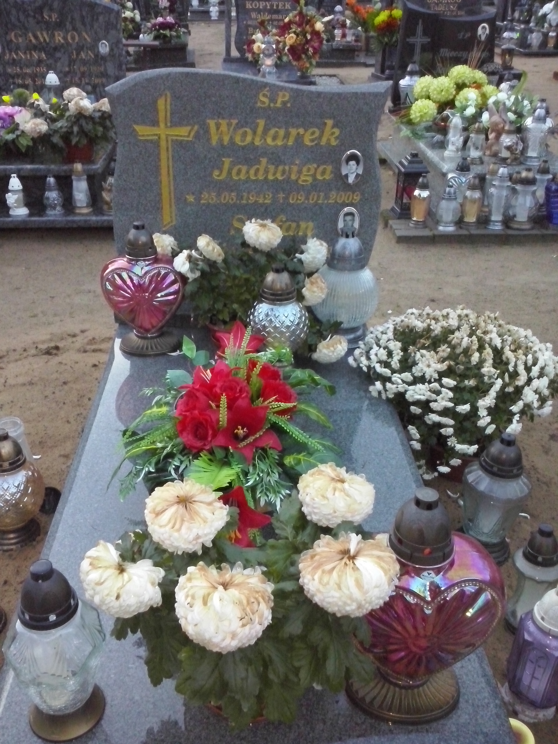 Grób: I,I,9i10 Wolarek Jadwiga Kazimiera ur.:1942-05-25 zm.:2009-01-09 Wolarek Stefan ur.:1934-03-17 zm.:2017-02-27 |
