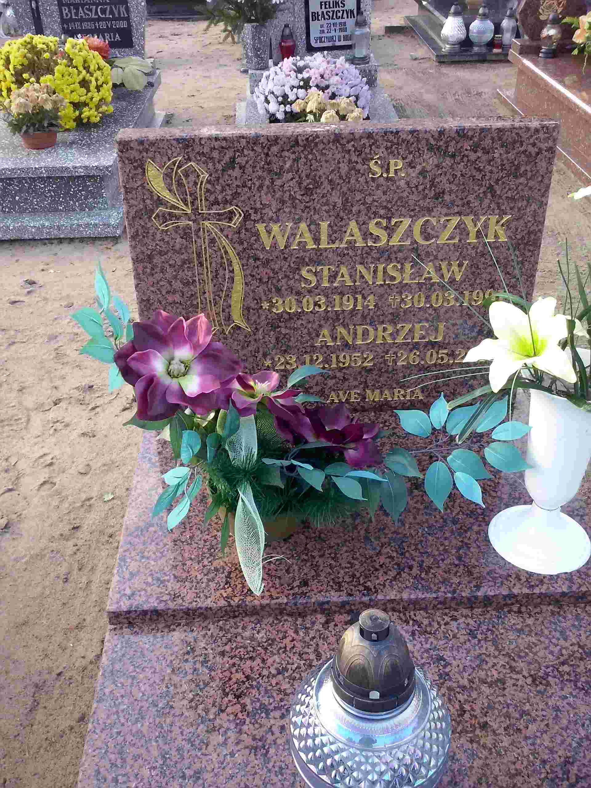 Grób: I,VI,4 Walaszczyk Stanisław ur.:1914-03-30 zm.:1991-03-30 Walaszczyk Andrzej,Jan ur.:1952-12-23 zm.:2013-05-26 |