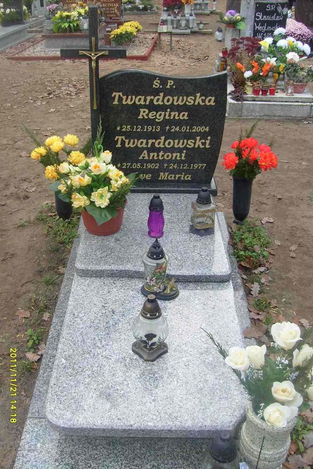 Grób: I,X,12 Twardowska Regina ur.:1913-12-25 zm.:2004-01-24 Twardowski Antoni ur.:1902-05-27 zm.:1977-12-24 |