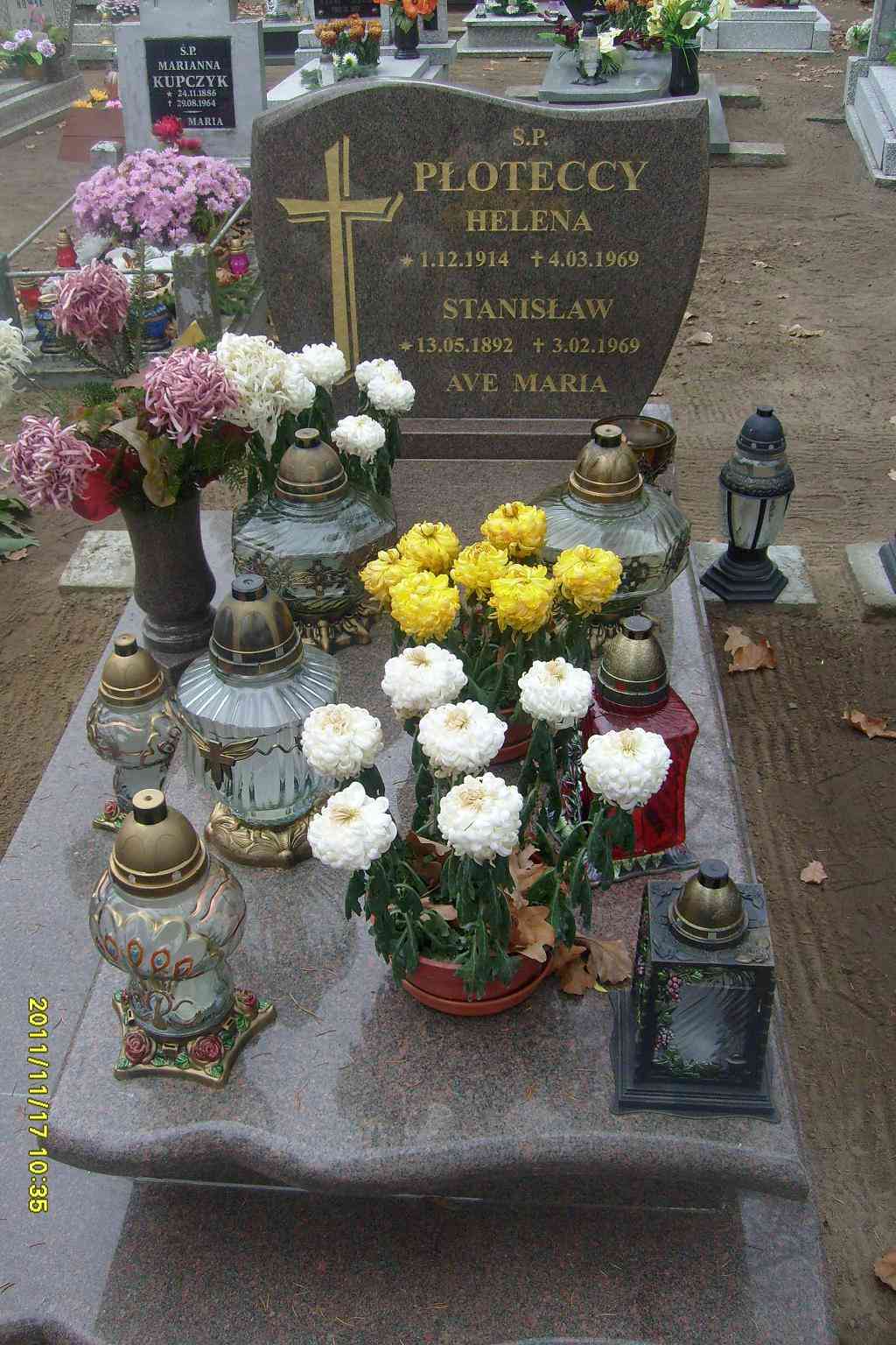 Grób: I,IX,8 Płotecka Helena ur.:1914-12-01 zm.:1969-03-04 Płotecki Stanisław ur.:1892-05-13 zm.:1969-02-03 |