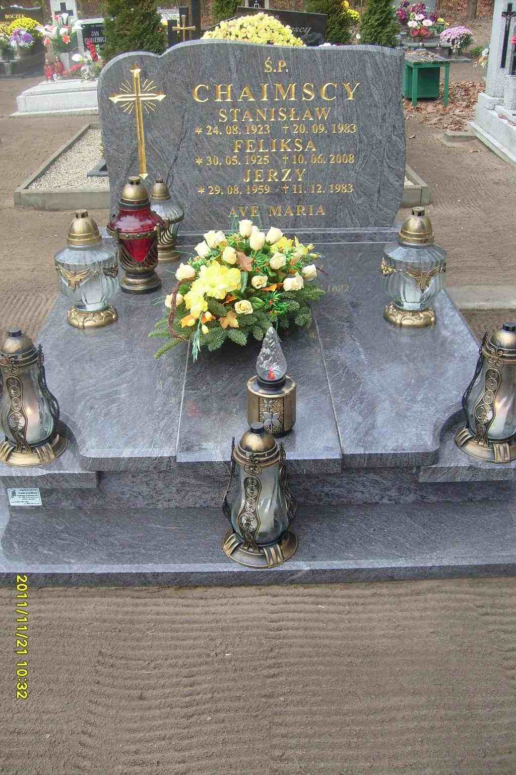 Grób: I,XIX,7i8 Chaimski Jerzy ur.:1959-08-29 zm.:1983-12-11 Chaimski Stanislaw ur.:1923-08-24 zm.:1983-09-20 Chaimska Feliksa ur.:1925-05-30 zm.:2008-06-10 |