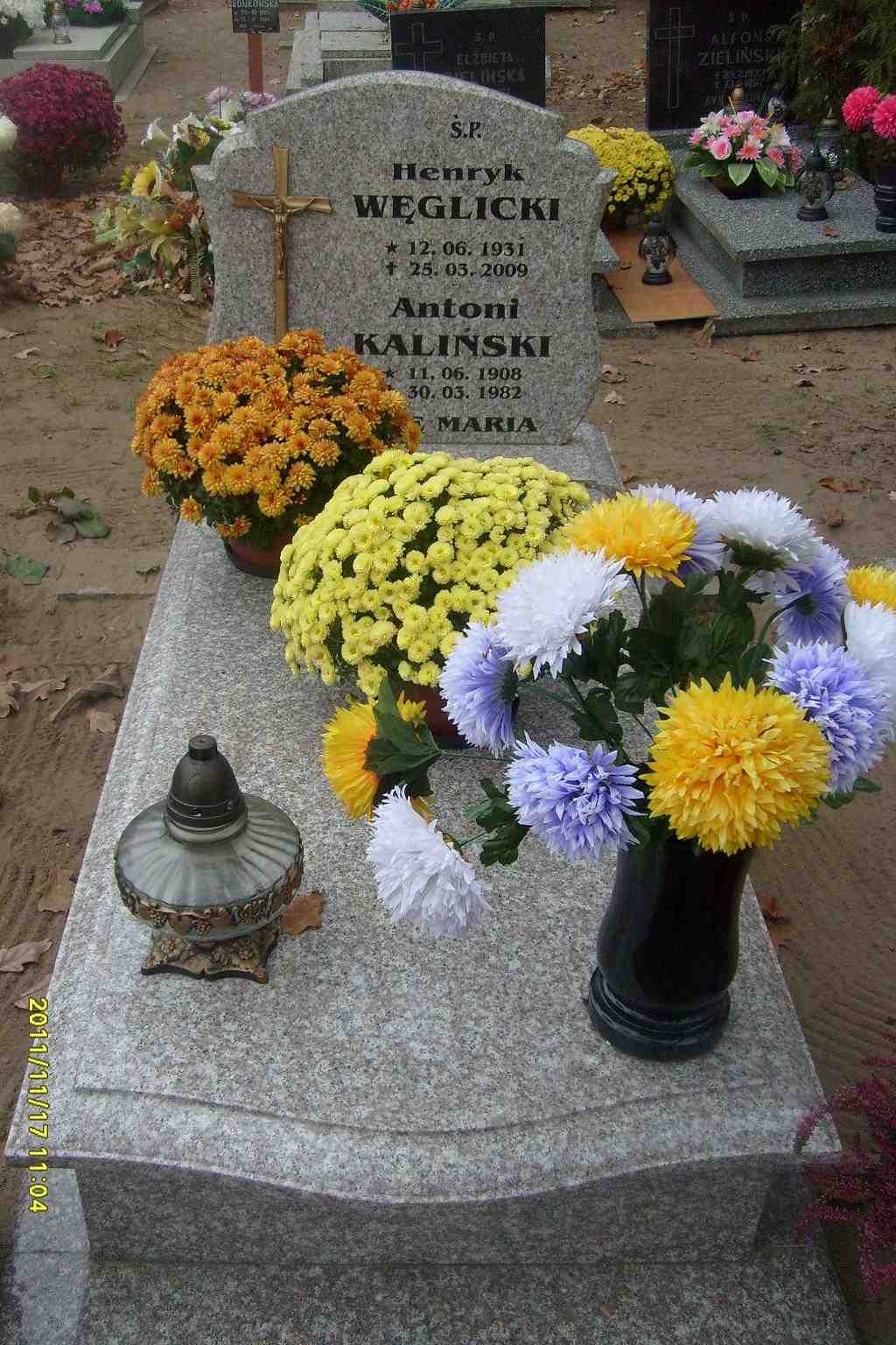 Grób: I,XVI,11 Kaliński Antoni ur.:1908-06-11 zm.:1982-03-30 Węglicki Henryk Ludwik ur.:1931-06-12 zm.:2009-03-25 |
