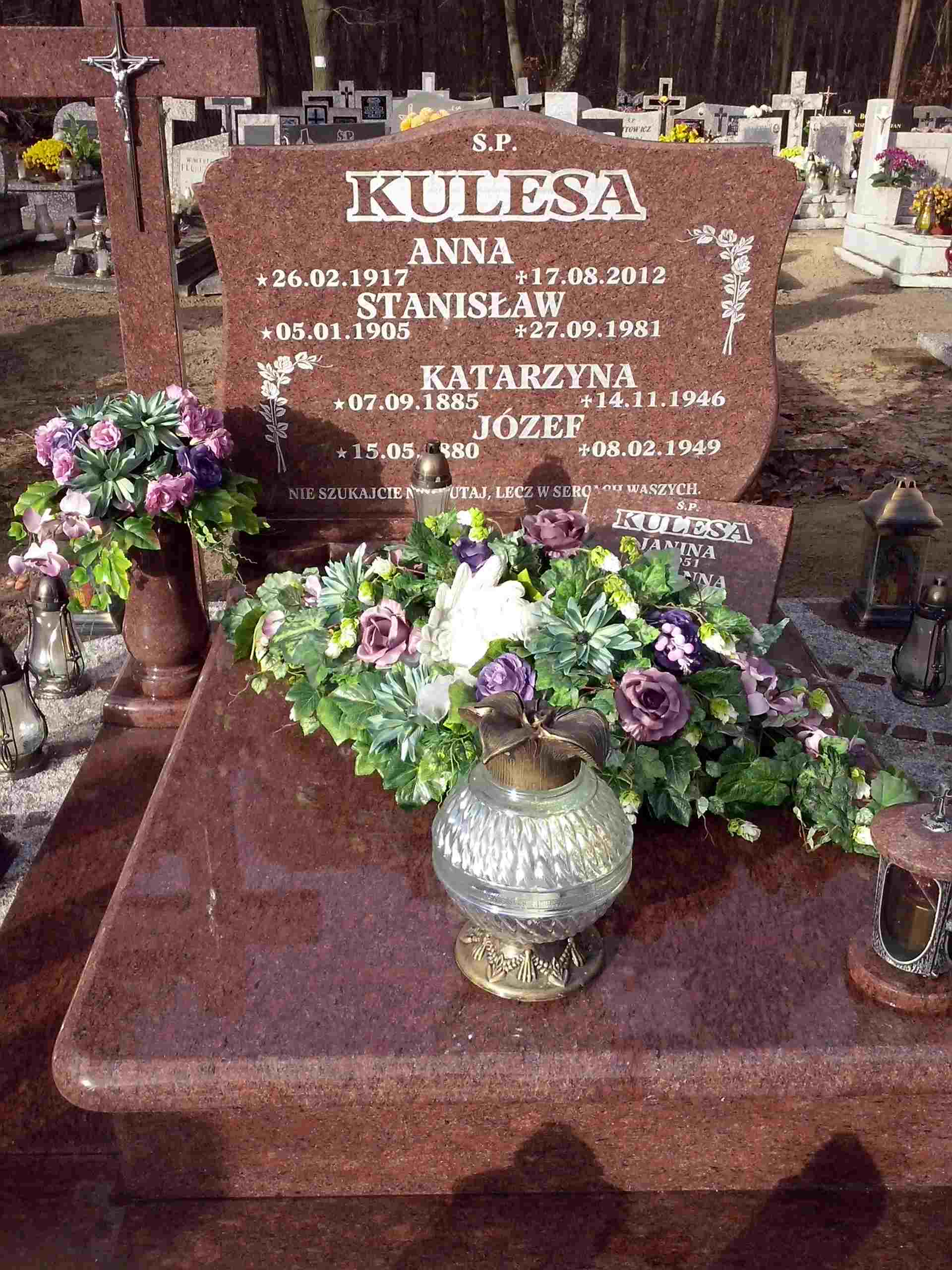 Grób: I,XVIII,4 Kulesa Anna ur.:1917-02-26 zm.:2012-08-17 Kulesa Marianna ur.:1952-04-11 zm.:1952-04-28 Kulesa Janina Helena ur.:1951-02-28 zm.:1951-03-17 Kulesa Józef ur.:1877-03-03 zm.:1952-04-28 Kulesa Katarzyna ur.: zm.:1946-11-14 Kulesa Wojciech ur.:1959-11-11 zm.:1959-11-11 Kulesa Stanisław ur.:1905-05-01 zm.:1981-09-27 Kulesa Antoni ur.:1947-05-10 zm.:2025-07-20 |
