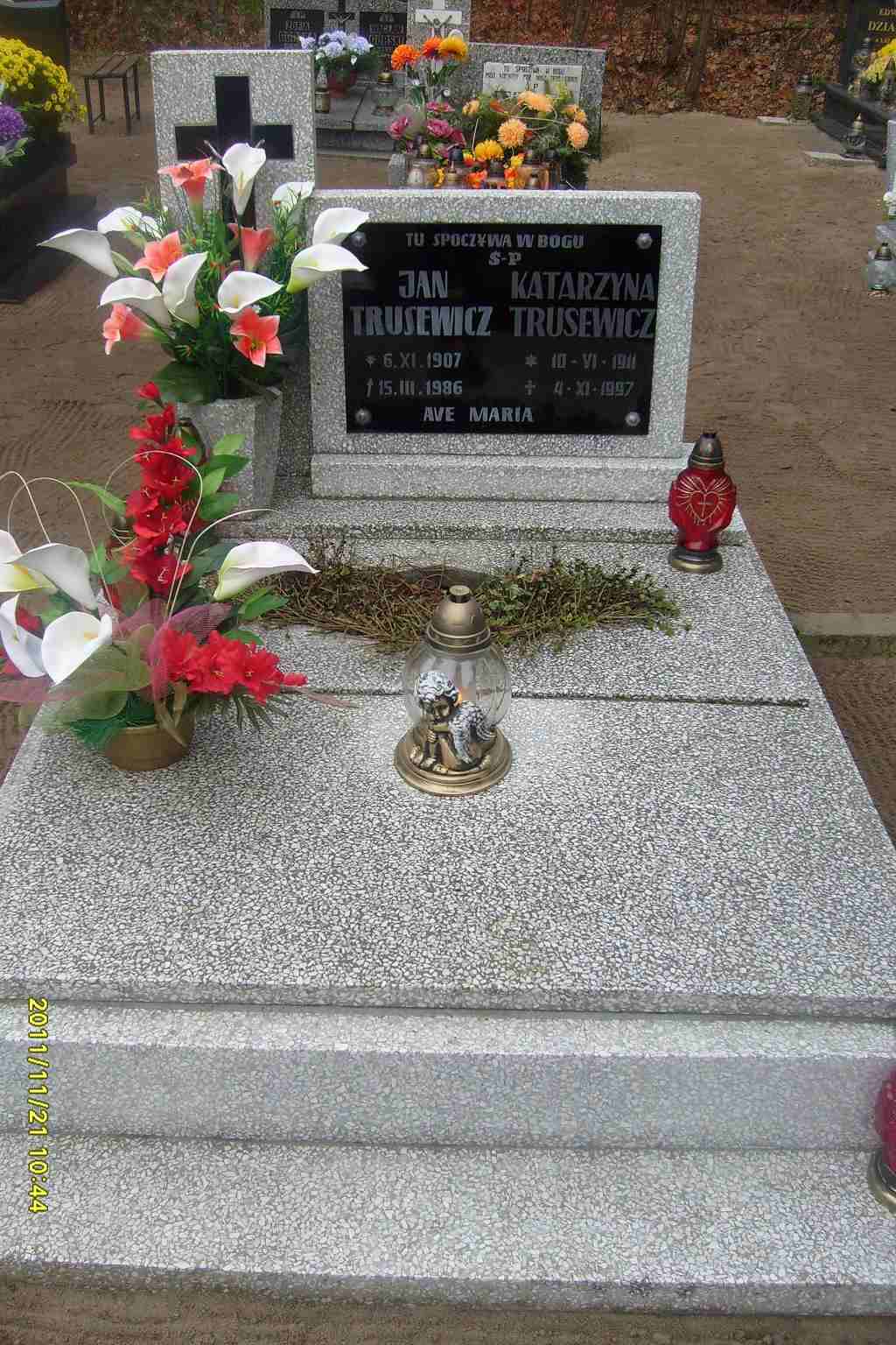 Grób: I,XXI,9i10 Trusewicz Jan ur.:1907-11-06 zm.:1986-03-15 Trusewicz Katarzyna ur.:1911-06-10 zm.:1997-11-04 |
