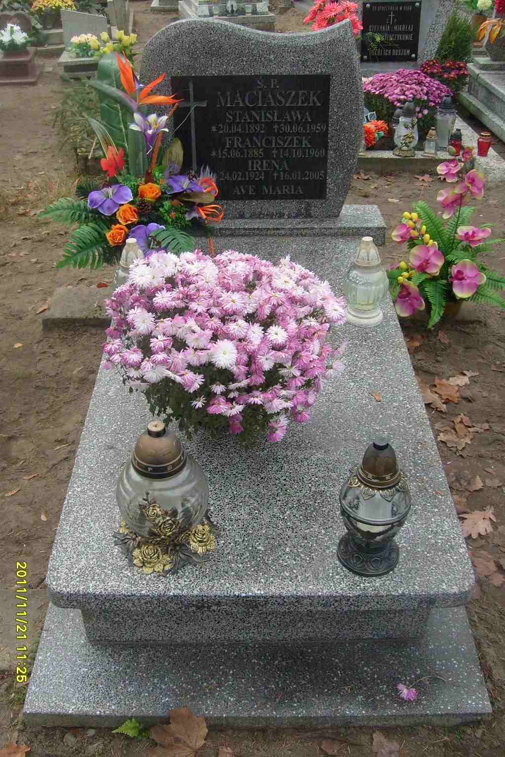 Grób: II,II,21 Maciaszek Stanisława ur.:1892-04-20 zm.:1959-06-30 Maciaszek Franciszek ur.:1885-06-15 zm.:1960-10-14 Maciaszek Irena ur.:1924-02-24 zm.:2005-01-16 |
