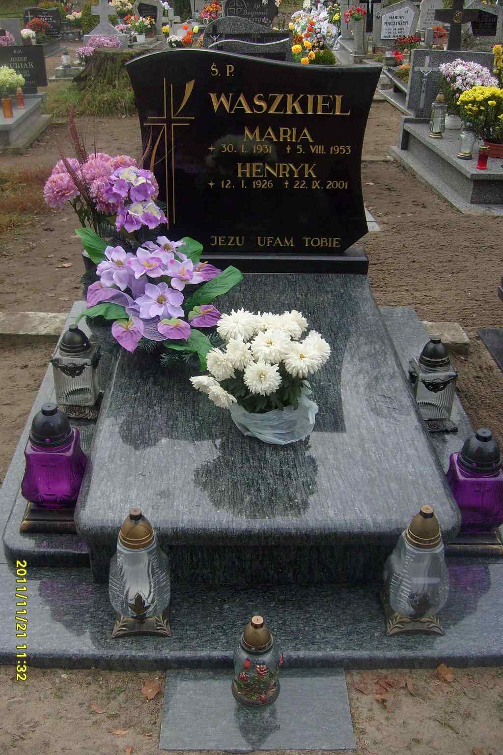 Grób: II,III,16i17 Waszkiel Maria ur.:1931-01-30 zm.:1953-08-05 Waszkiel Henryk ur.:1926-01-12 zm.:2001-09-22 Waszkiel Halina ur.:1934-01-01 zm.:2013-10-15 |
