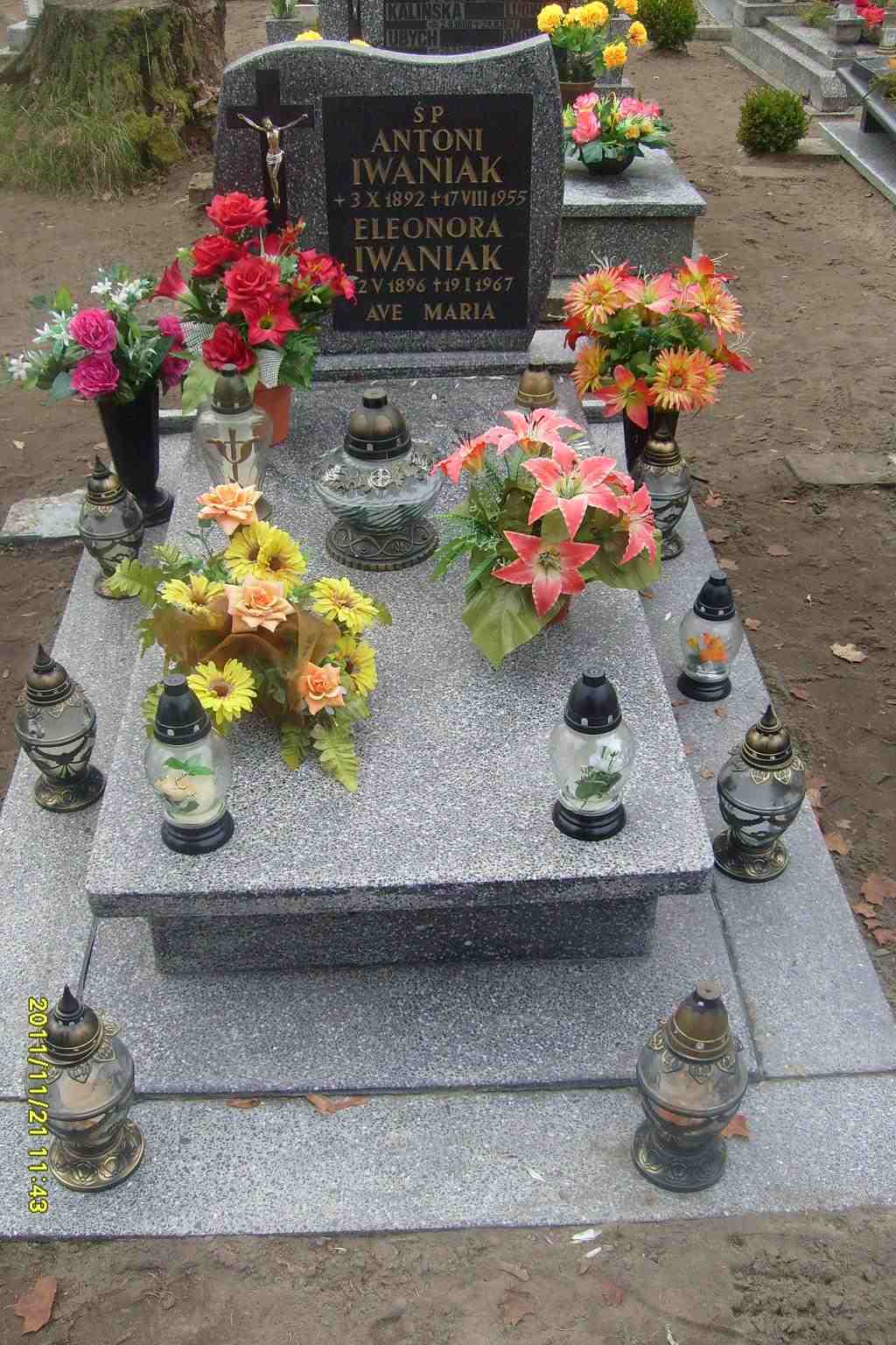 Grób: II,IV,11i12 Iwaniak Antoni ur.:1892-10-03 zm.:1955-08-17 Iwaniak Eleonora ur.:1896-05-02 zm.:1967-01-19 |