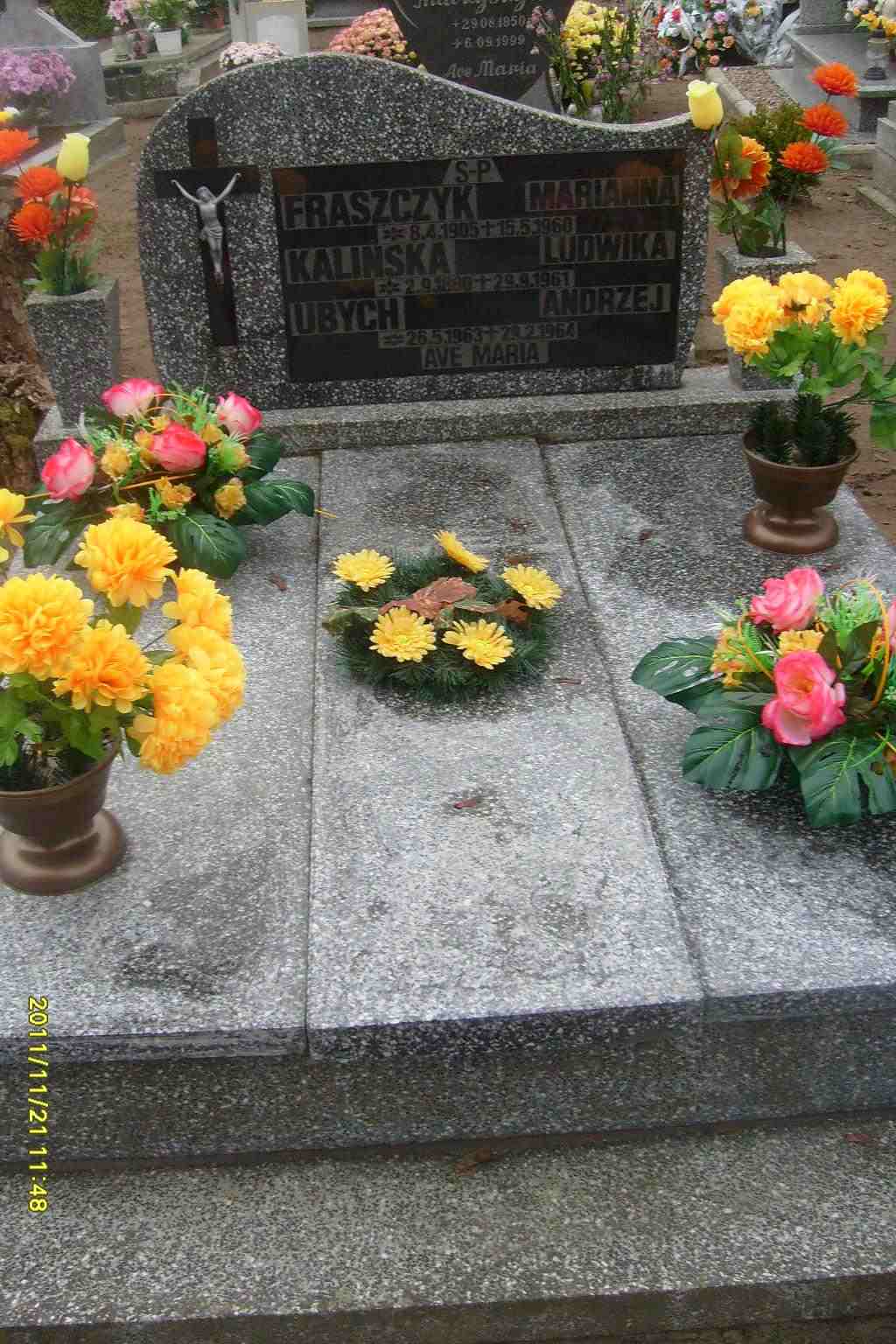 Grób: II,V,11i12 Fraszczyk Marianna ur.:1905-04-08 zm.:1960-05-15 Kalińska Ludwika ur.:1880-09-02 zm.:1961-09-29 Ubych Andrzej ur.:1963-05-26 zm.:1964-02-29 |