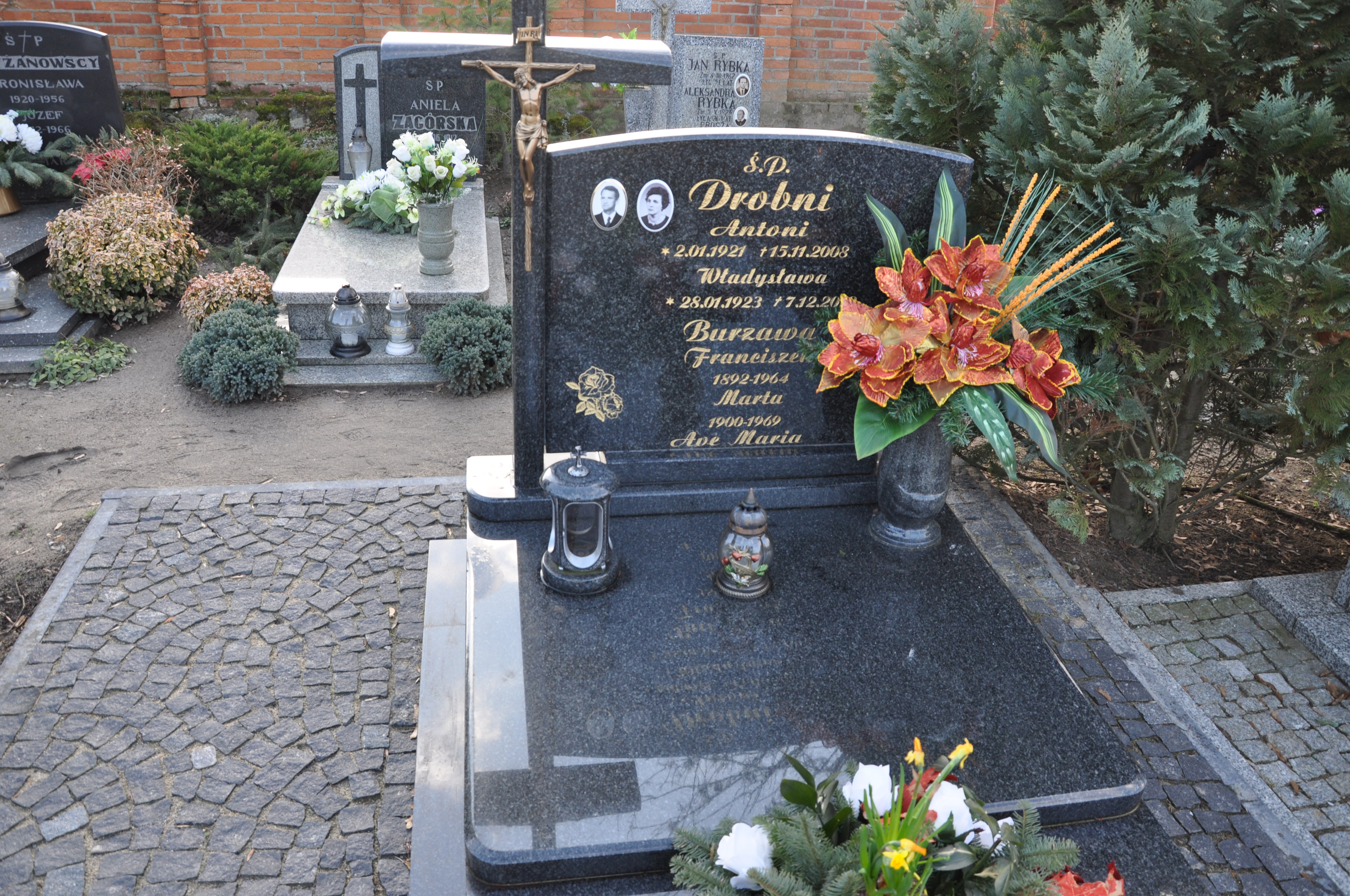 Grób: IV.2.21 Drobny Antoni ur.:02.01.1921 zm.:15.11.2008 Burzawa Franciszek ur.:1892 zm.:1964 Burzawa Marta ur.:1900 zm.:1969 Drobna Władysława ur.:28.01.1923r. zm.:07.12.2012r. |