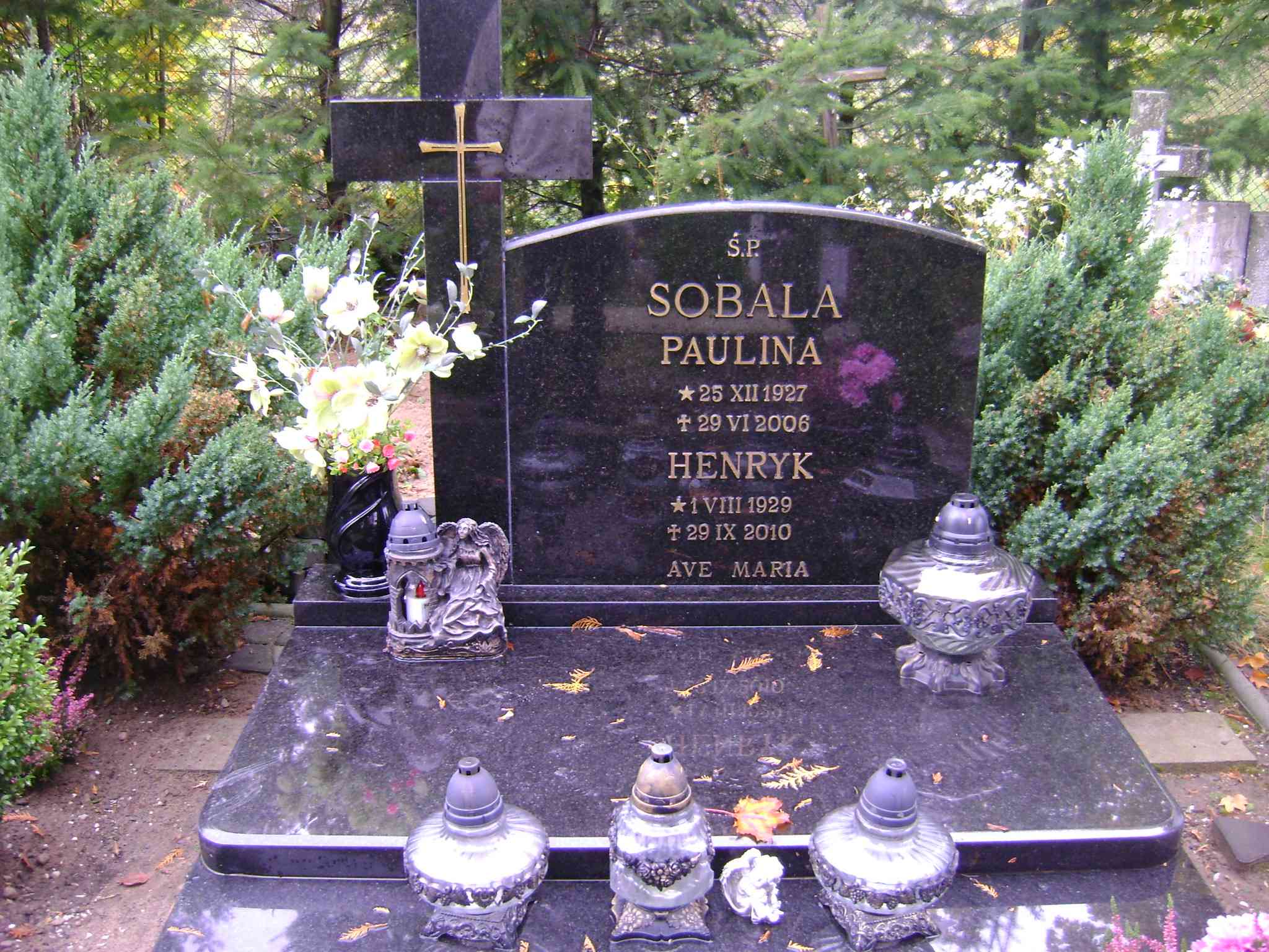 Grób: Ib.2.19 Sobala Paulina ur.:25.12.1927 zm.:29.06.2006 Sobala Henryk ur.:01.08.1929 zm.:29.09.2010 |