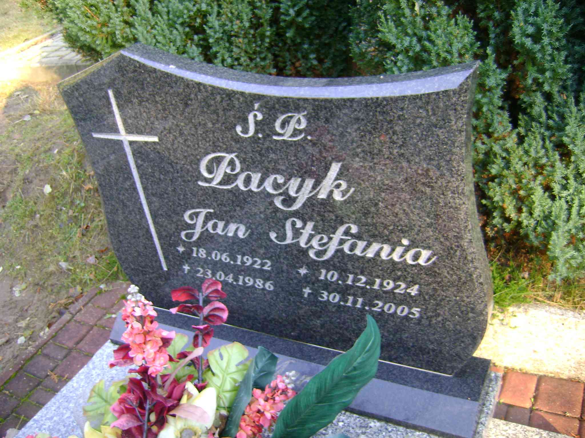 Grób: II.9.13 Pacyk Jan ur.:18.06.1922 zm.:23.04.1986 Pacyk Stefania ur.:10.12.1924 zm.:30.11.2005 |