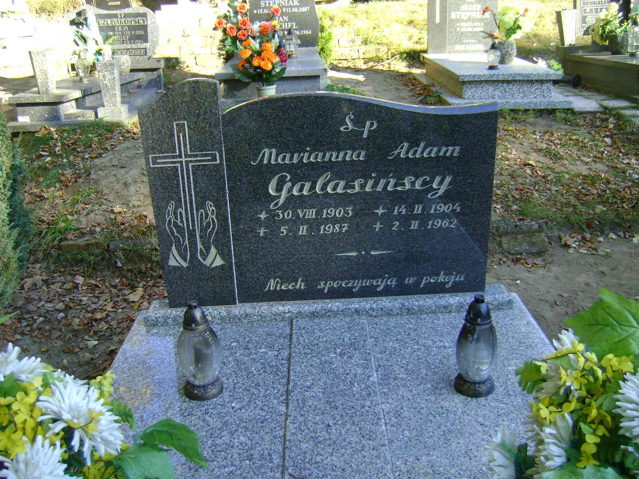 Grób: II.9.4 Galasińska Marianna ur.:30.08.1903 zm.:05.02.1987 Galasiński Adam ur.:14.02.1904 zm.:02.02.1962 |
