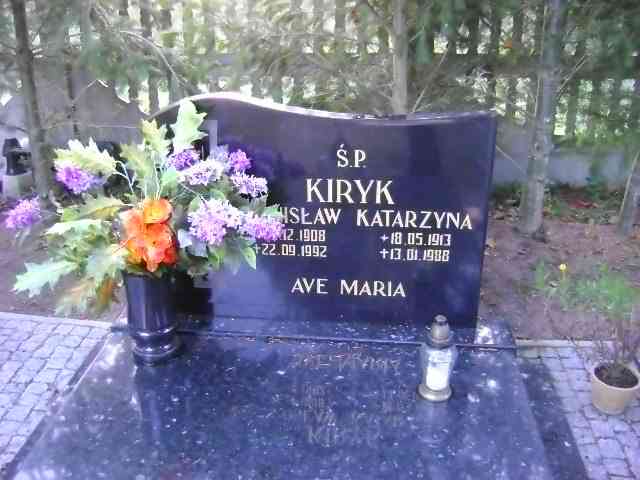 Grób: I.8.6 Kiryk Katarzyna ur.:18.05.1913 zm.:13.01.1988 Kiryk Stanisław ur.:24.12.1908 zm.:22.09.1992 |