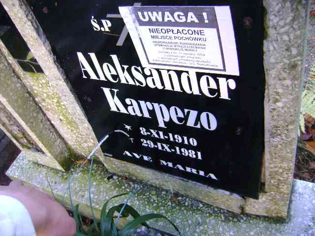 Grób: II.4.9 Karpezo Aleksander ur.:08.11.1910 zm.:29.09.1981 Romaszko Krystyna ur.:25.05.1945 zm.:23.09.2015 |