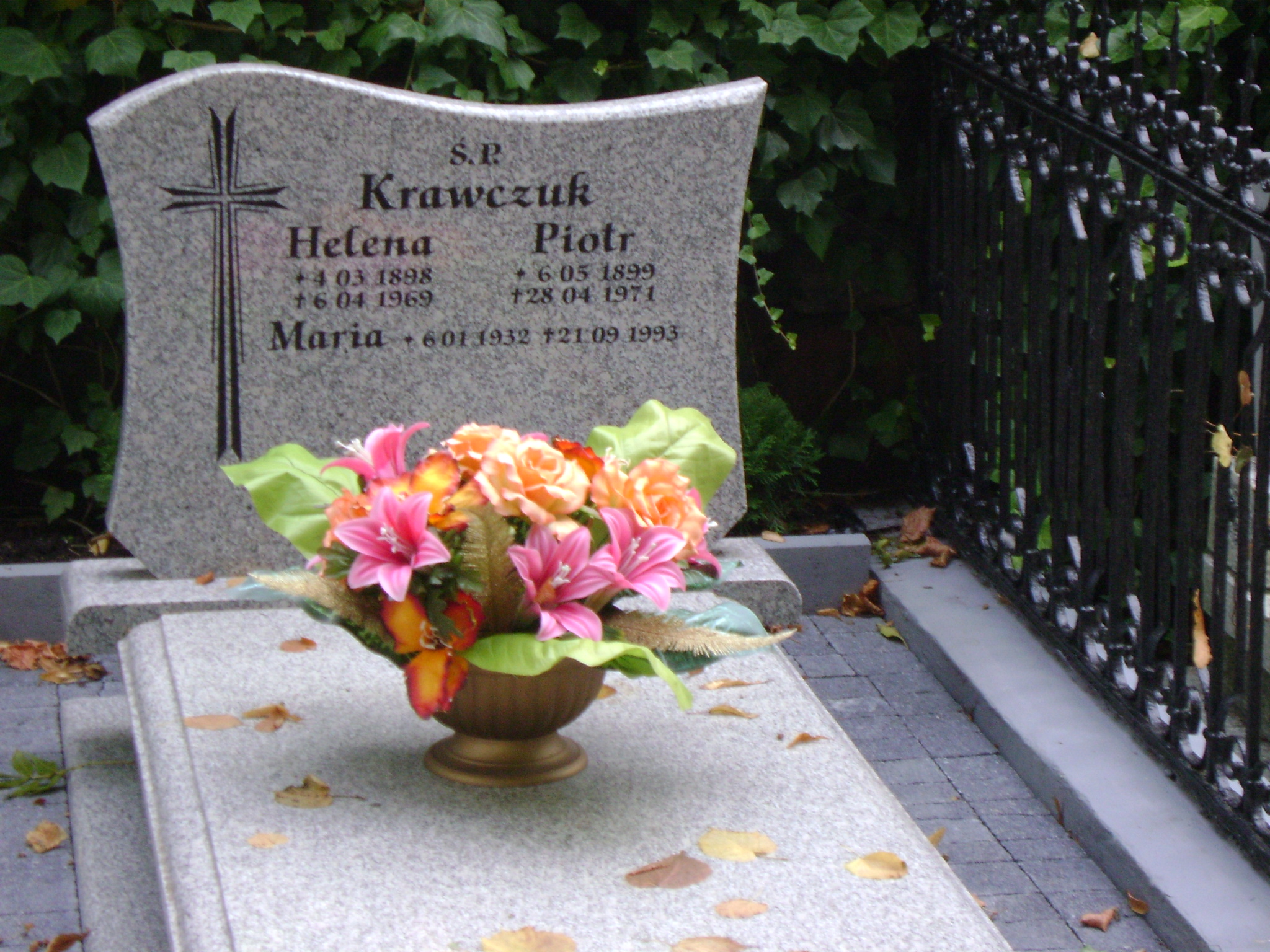 Grób: I.3.4 Krawczuk Helena ur.:04-03-1898 zm.:06-04-1969 Krawczuk Maria ur.:06-01-1932 zm.:21-09-1993 Krawczuk Piotr ur.:06-05-1895 zm.:28-04-1971 |