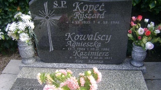 Grób: V.1.4 Kopeć Ryszard ur.:04-07-1935 zm.:04-12-1998 Kowalska Agnieszka ur.:11-01-1904 zm.:30-11-1986 Kowalski Kazimierz ur.:06-10-1900 zm.:30-03-1971 Zielińska Janina ur.:27-04-1930 zm.:17-01-2007 |