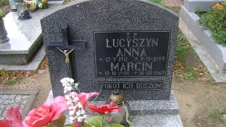 Grób: X.11.6 Łucyszyn Marcin ur.:10-03-1908 zm.:18-12-1969 Łucyszyn Anna ur.:12-05-1911 zm.:09-04-1993 Łucyszyn Czesława ur.:07-09-1949 zm.:23-01-2023 |
