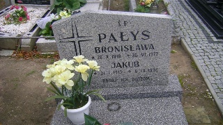 Grób: X.3.2 Pałys Bronisław ur.:26-10-1918 zm.:30-06-1972 Pałys Jakub ur.:21-01-1913 zm.:06-09-1996 Pałys Stanisława ur.:16-12-1960 zm.:10-06-2019 |
